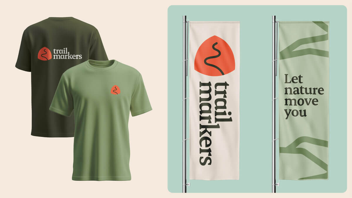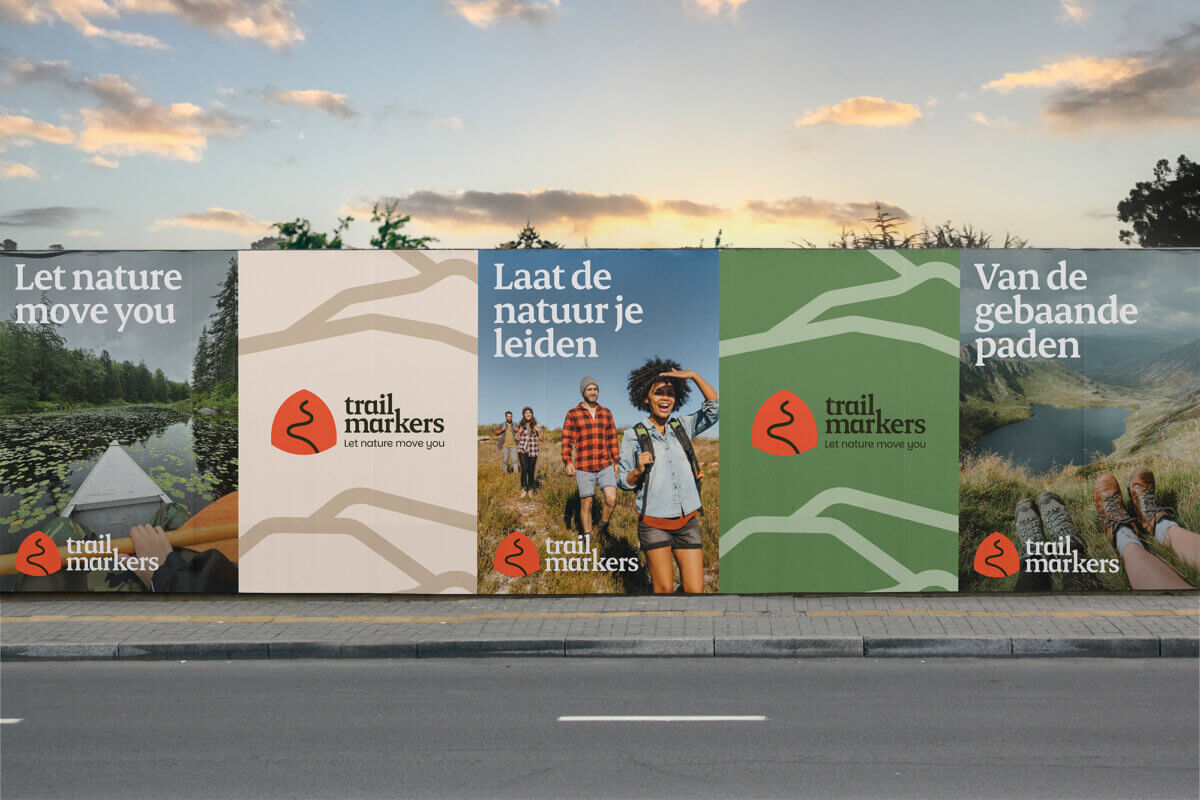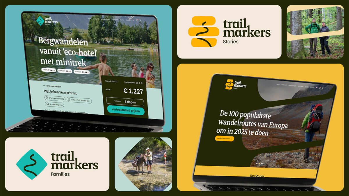 We ontwikkelden een visuele identiteit voor Trail Markers, met een iconisch vignet voor het hoofdmerk en de labels: Families en Stories. De vormentaal en kleuren zijn geïnspireerd op trailmarkeringen in de natuur. Felle kleuren contrasteren met natuurlijke groen en aardetinten. De grafische vormen worden als masker toegepast, waardoor de fotobibliotheek van Trail Markers met het reisaanbod een eigen en herkenbaar karakter krijgt. Reisfotografie wordt afgewisseld met close-ups van natuurlijke structuren en een point-of-view perspectief, wat je in de reisbeleving trekt. De vriendelijke typografie voor het woordmerk en de headings straalt rust en autoriteit uit. Een uitnodiging om onbezorgd en vol vertrouwen op reis te gaan in de natuur.