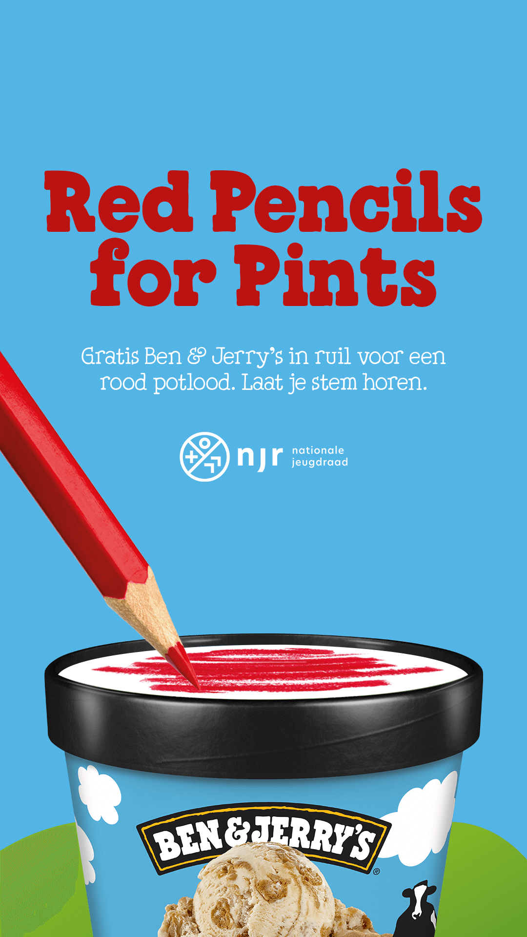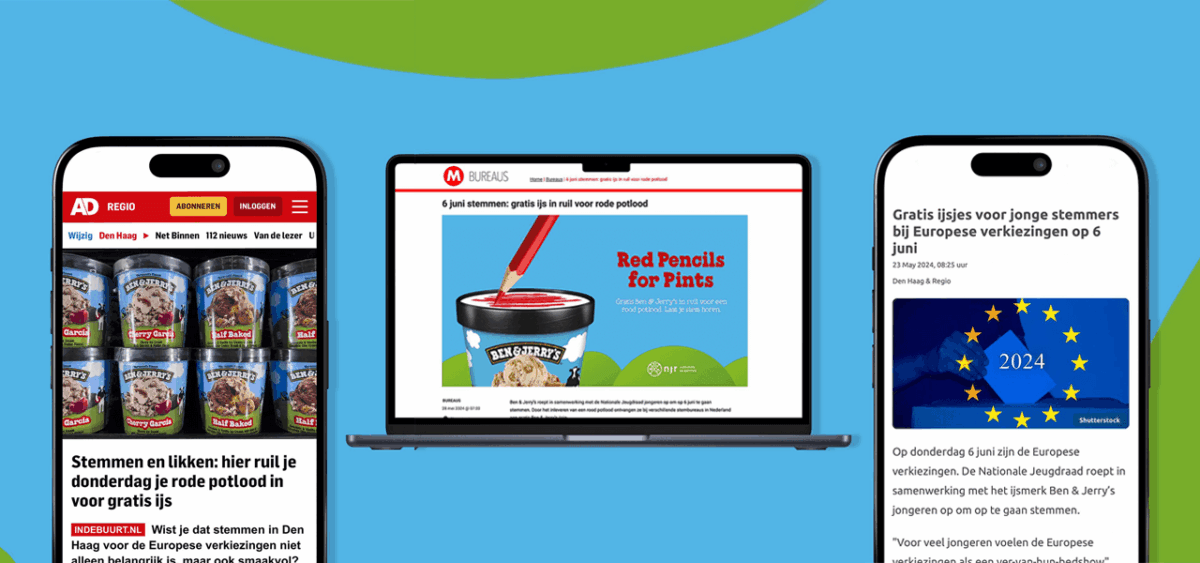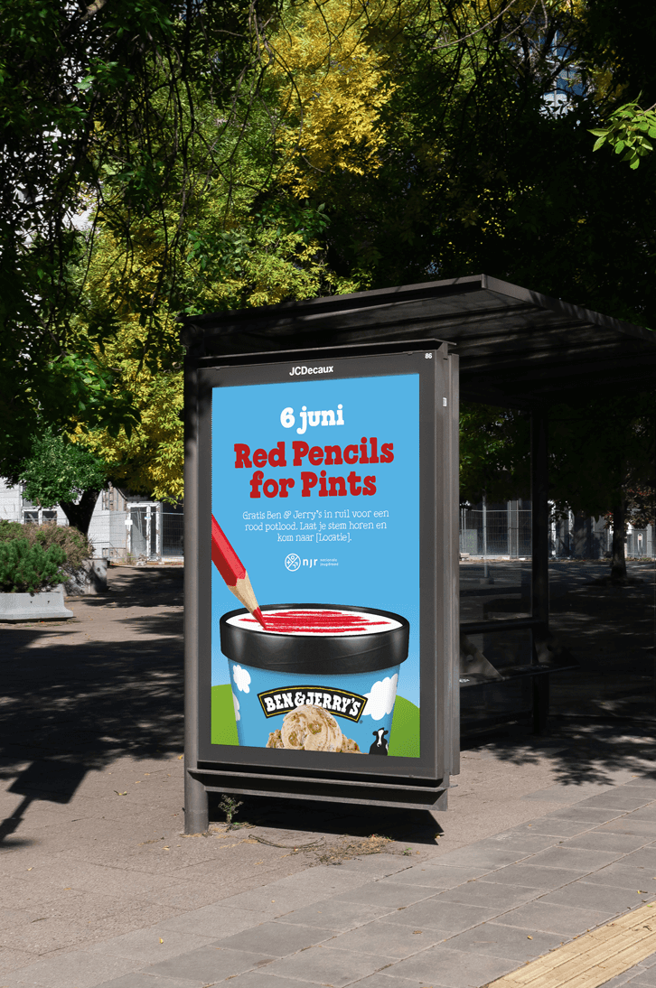 In ruil voor een rood potlood ontvingen jongeren op 6 juni bij stembureaus in Amsterdam, Rotterdam, Utrecht, Den Haag en Groningen een gratis Ben & Jerry’s ijsje. De pers pikte niet alleen de actie op maar bracht op deze manier ook de samenwerking met de Nationale Jeugdraad en de impactpijlers van Ben & Jerry’s onder de aandacht.